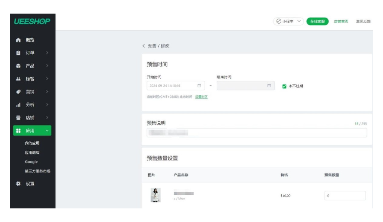 Ueeshop预售功能,支持卖家轻松添加预售产品,并支持自定义预售按钮的文案和背景颜色,使预售页面更具吸引力。此外,预售功能,还支持设置预售时间、库存数量,这能够进一步强化限量的概念,从而吸引更多消费者的关注和购买。