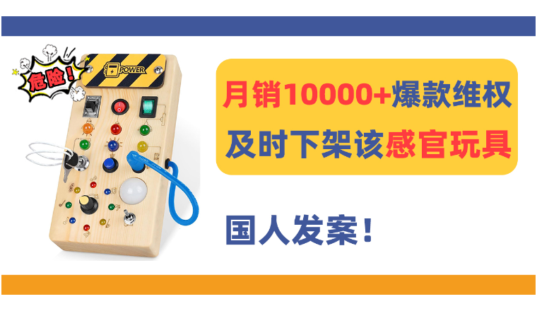 本案原告又是我国卖家,维权一款Busy Board感官玩具,这个感官玩具上设置了8个不同的开关,每个开关对应不同颜色或风格的LED灯。可以锻炼宝宝的思维能力和动手能力。
