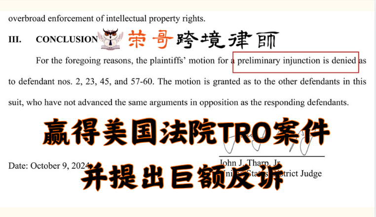 至此,荣哥团队经办的跨境电商在美国法院对TRO/PI案例中,80%以上的案件赢得了美国法院对PI裁定,即认定中国电商产品不侵犯美国的知识产权。
